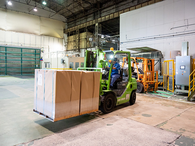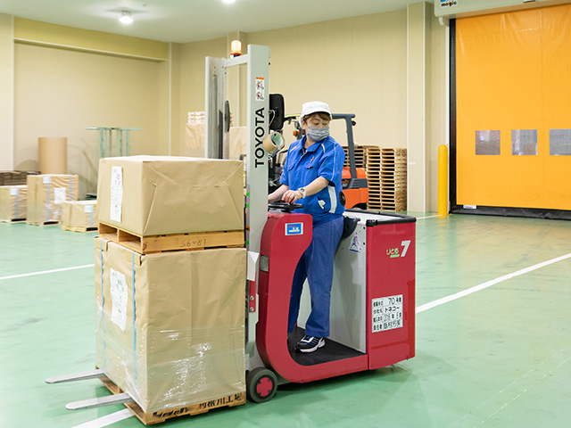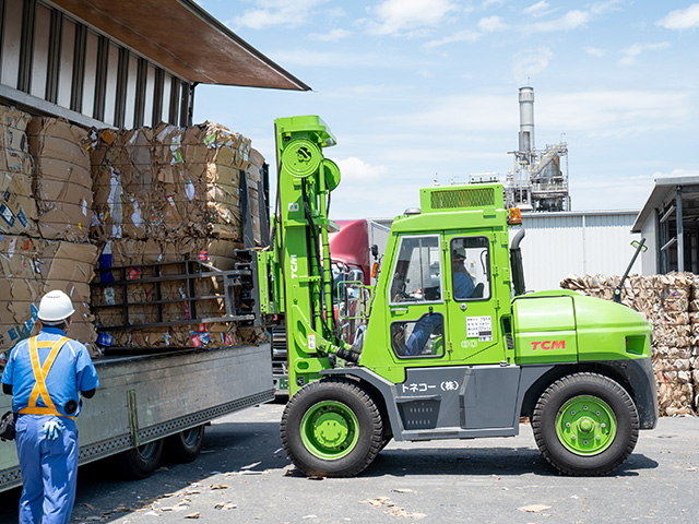 原料となるパルプや段ボール古紙を荷卸し。大型のリフトを活用し、効率よく荷卸しを行ないます。