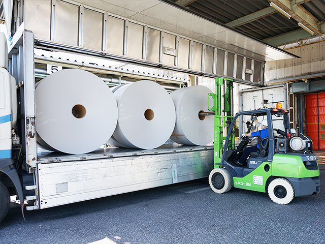 お客様が稼動する製紙工場にて、弊社では物流の請負作業と共に、物流の請負作業を行なっています。責任を持って原料の荷卸しと製品の出荷を行なっています。